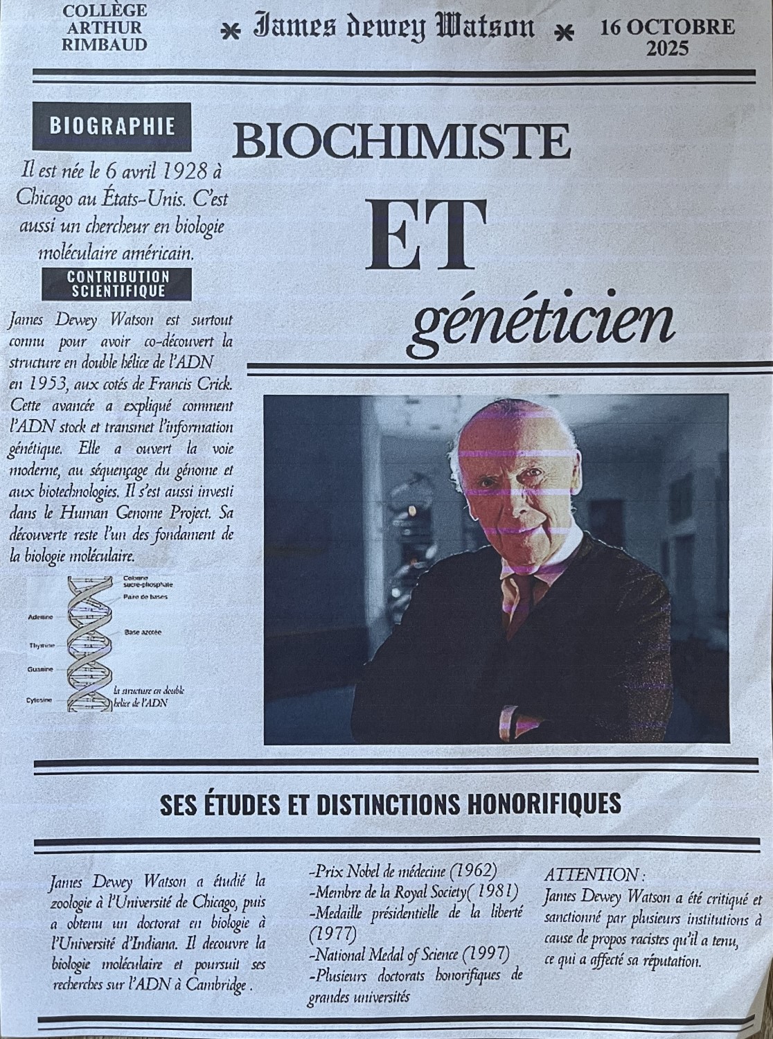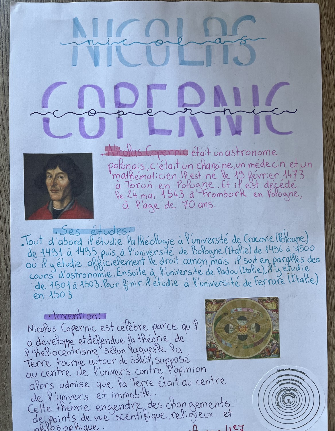 En début d’année, les élèves de 4ème ont tiré au sort le nom d’un ou d’une scientifique célèbre - d’Isaac Newton à Rosalind Franklin, en passant par Galilée - sur lequel ils ont dû réaliser une affiche sur sa vie et sa contribution scientifique.